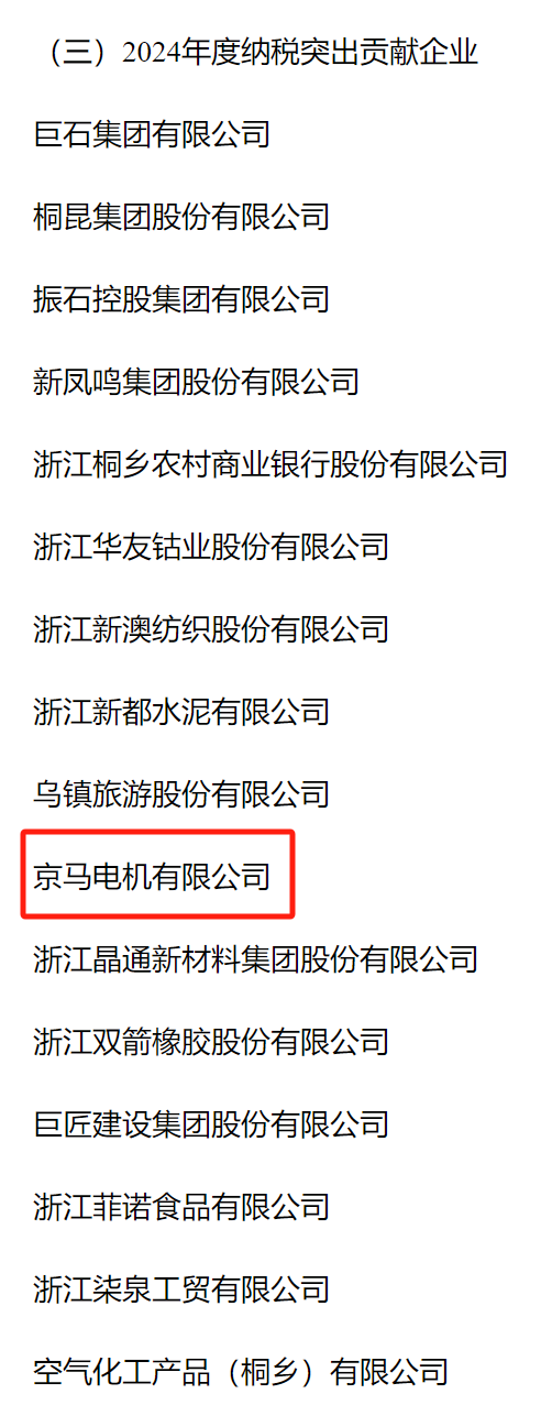 2025年2月6日,桐鄉(xiāng)市政府正式發(fā)布了《全市三級(jí)干部表彰大會(huì)和通報(bào)表揚(yáng)名單》,京馬電機(jī)榮獲桐鄉(xiāng)市2024年納稅突出貢獻(xiàn)企業(yè)和數(shù)字經(jīng)濟(jì)發(fā)展優(yōu)秀企業(yè)二項(xiàng)榮譽(yù)稱號(hào)。